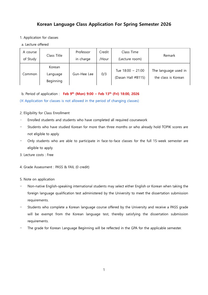[Notice] Application for Korean Language Classes for Foreign Students, Spring 2026