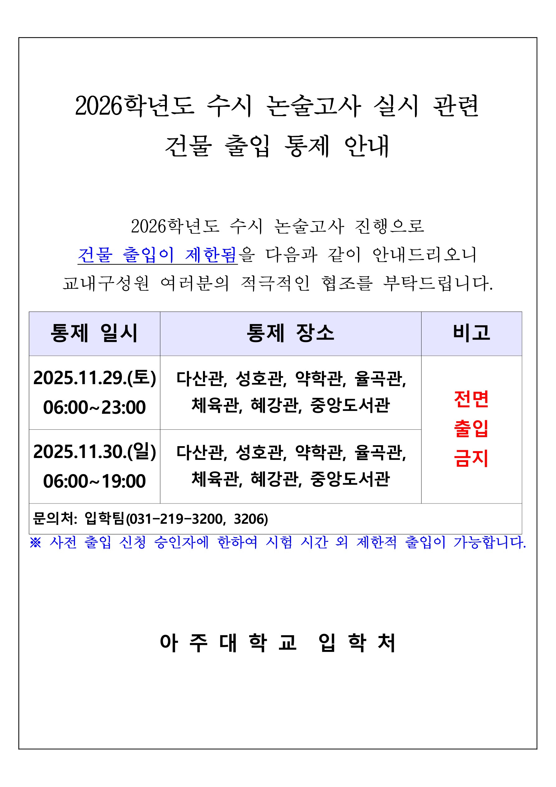 2026학년도 수시 논술고사 진행에 따른 건물 출입 제한을 안내드립니다.
