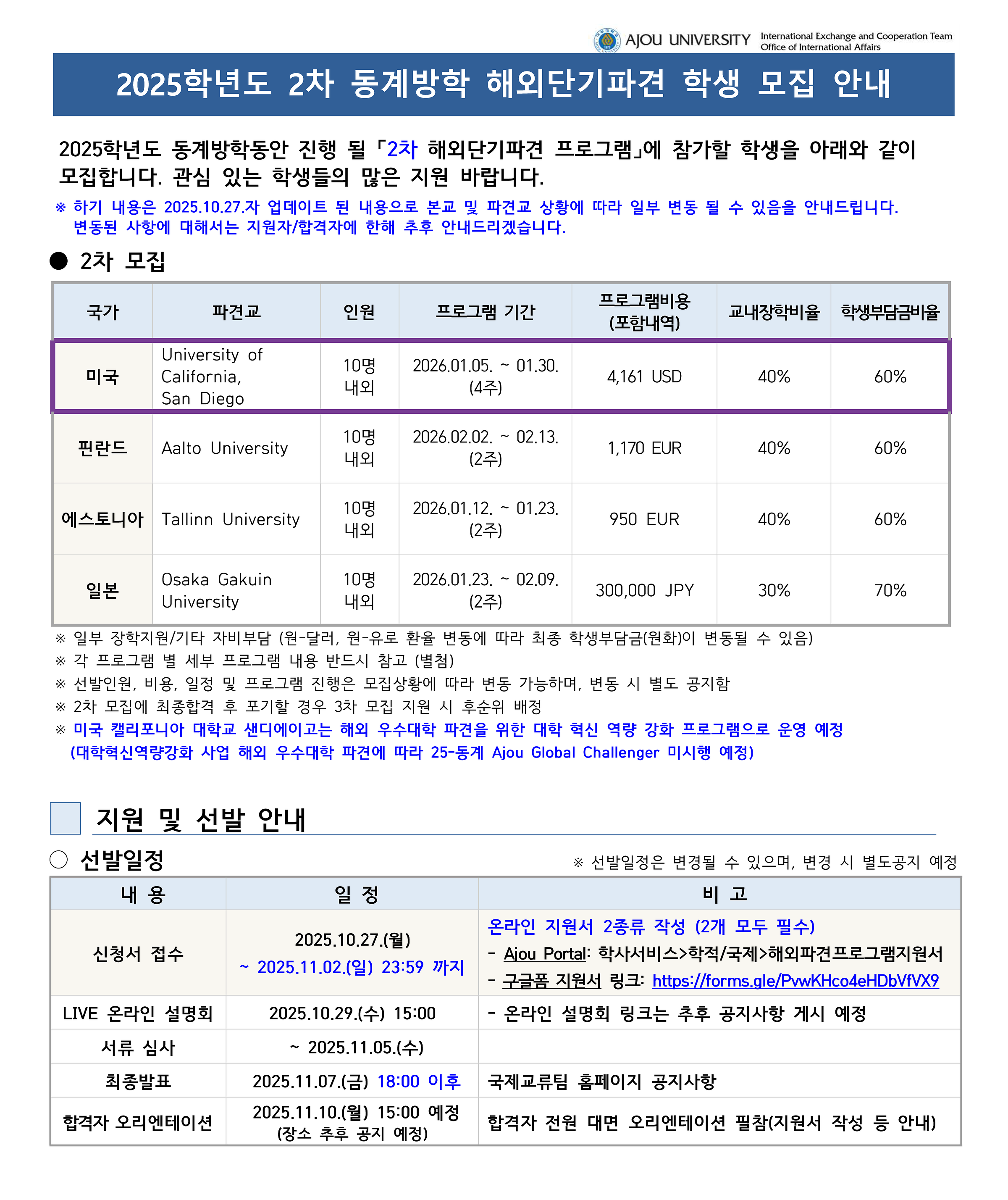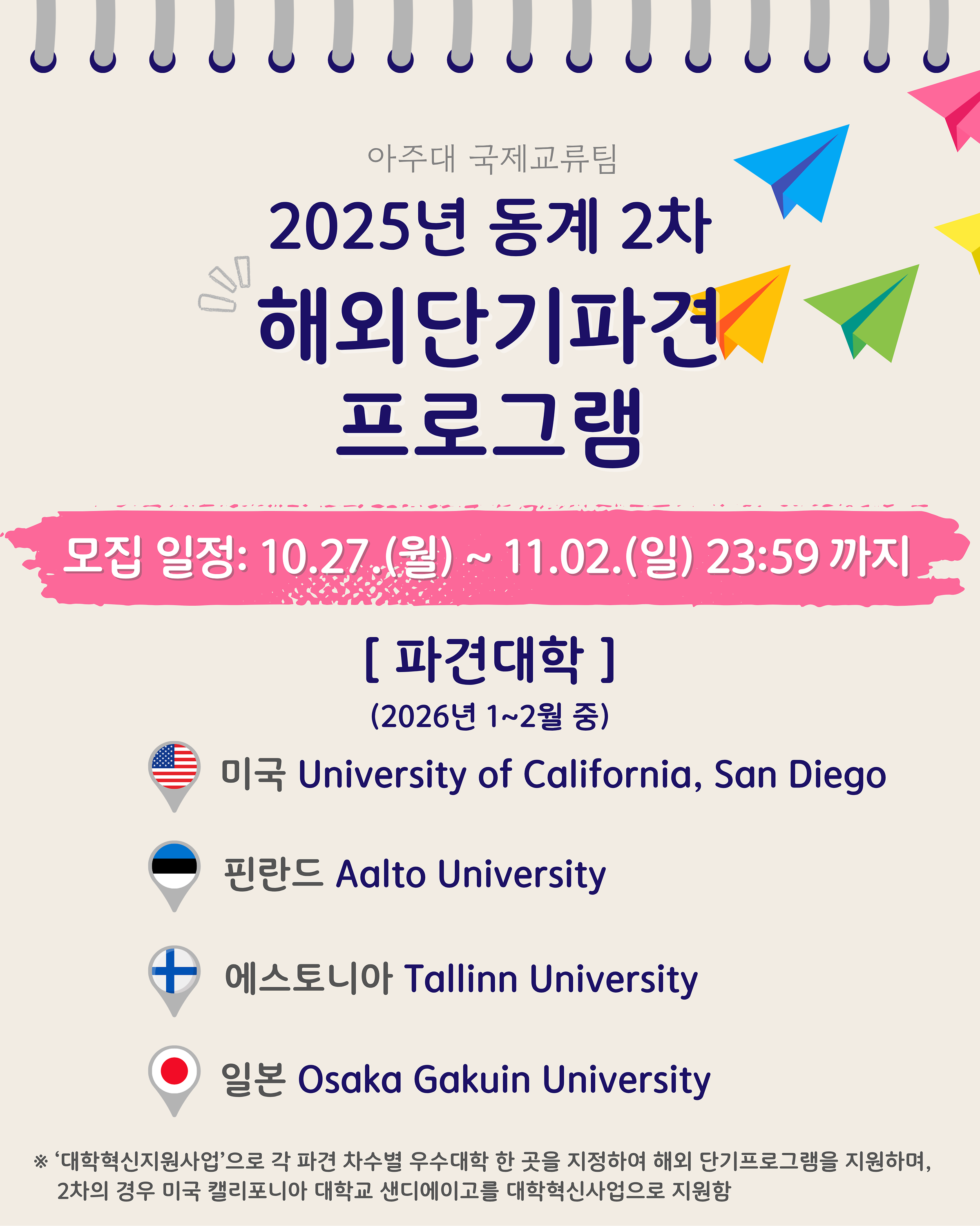 [공지] [국제교류팀] [동계 2차] 2025 해외단기파견 프로그램 참가자 모집 (10/27~11/2)