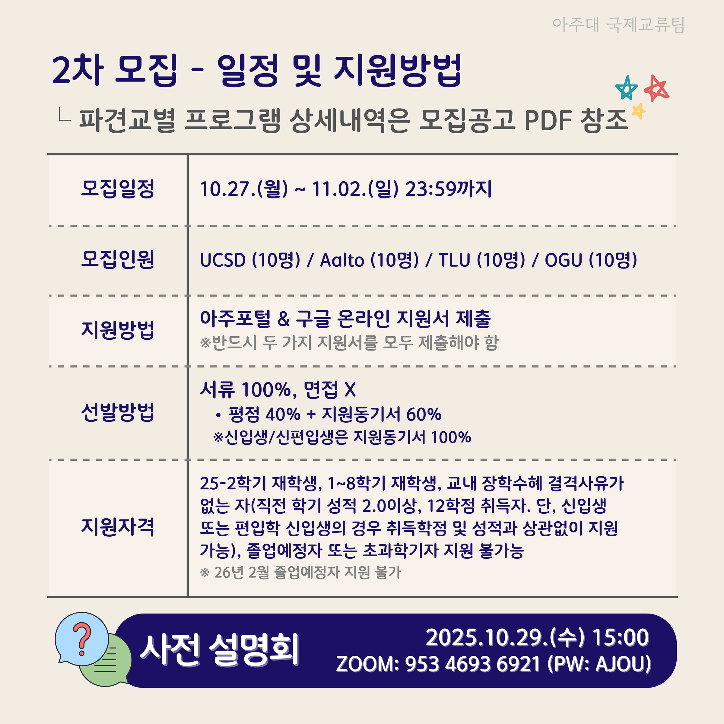 - ZOOM 온라인 사전설명회 진행: 10.29.(수) 15:00 (회의실 코드: 953 4693 6921 / PW: AJOU)